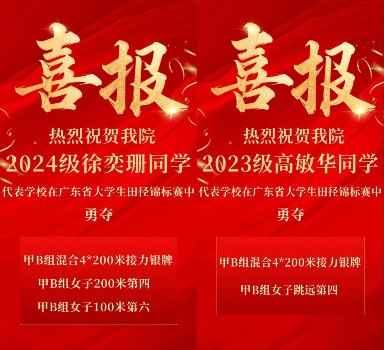 学院积极推动“读书报国,强体励志”校园体育文化,促进同学们德智体美劳全面发展。2025年,我院学生在第十二届广东省大学生运动会上表现突出,2023级高敏华同学和2024级徐奕珊同学荣获甲B组混合4*200米银牌;徐奕珊更以13.06 秒打破女子100米校纪录。同年校运会中,她以26.63秒的优异成绩刷新了广东医科大学尘封多年的女子200米记录,教工组与学生女子组分获佳绩,展现了昂扬向上的精神风貌。