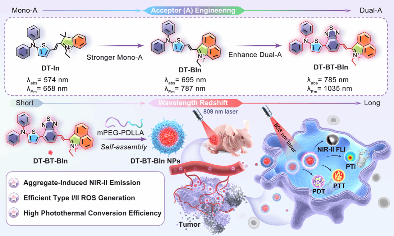 针对离子型光诊疗剂在临床应用中普遍存在的吸收/发射波长短、光稳定性不足以及聚集导致治疗效率下降等关键瓶颈,团队创新性地提出双受体工程策略,在强供电子取代基二苯胺噻吩基团上引入苯并噻二唑和苯并[c,d]吲哚鎓双受体单元,成功构建了一种离子型聚集诱导近红外二区(NIR-II)光诊疗剂DT-BT-BIn。该诊疗剂在聚集态下仍保持优异的 NIR-II 发光性能,并兼具高效的光动力与光热治疗能力及良好的光稳定性。研究表明,该诊疗剂自组装形成的纳米探针DT-BT-BIn NPs可被体外肿瘤细胞高效摄取,在光照条件下有效破坏线粒体膜电位,诱导肿瘤细胞凋亡;同时,在体内实验中实现了NIR-II荧光/光热成像指引下的精准肿瘤消融,并展现出良好的生物安全性。该研究为高性能 NIR-II 离子型光诊疗剂的开发提供了新思路,为肿瘤精准光疗的发展奠定了重要基础。