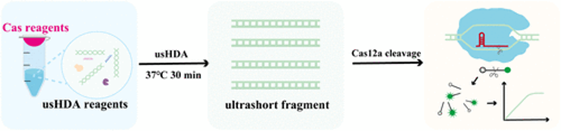 针对上述问题,本研究创新性地提出了“超短 HDA(usHDA)” 概念,提出并验证了 “提高解旋酶与核酸模板的摩尔比,提高解旋酶的解旋效率,进一步提高扩增效率” 的科学假设。为了克服HDA技术的假阳性突出的问题,本研究引入了CRISPR/Cas检测技术。基于此,本研究用usHDA快速扩增一段仅包含引物结合区和 Cas12a 的 crRNA 识别区超短片段,完美适配后续CRISPR/Cas12a检测。结合CRISPR/Cas12a 的高特异性检测,克服了引物二聚体引起的非特异性反应,解决了HDA假阳性问题。通过构建一锅法usHDA CRISPR/Cas12a检测平台用于核酸检测,实现了 “快速扩增 + 高特异性检测” ,完美地解决了传统HDA技术的核心痛点。该检测平台在37℃ 的单一温度条件下进行恒温反应,扩增仅需 30 分钟,全程检测 1 小时内完成,灵敏度达 5 aM,具有快速、超敏、高特异等特点。